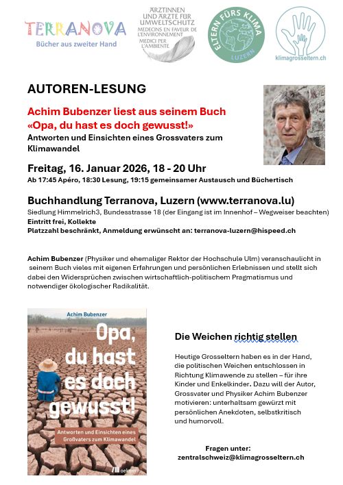 Nach einem reichlichen Apéro folgten über 60 Personen der Lesung. Achim Bubenzer verstand es, die Anwesenden mit Fakten zur Klimaentwicklung zu fesseln. Mit Abschnitten aus seinem Buch "Opa, du hast es doch gewusst" beschrieb er, dass durch die Folgen des mangelhaften Klimaschutzes seine Enkelkinder und unsere keine erfreuliche Zukunft in Aussicht haben. Im Buch beschreibt der Autor Ursachen und Erklärungen dazu, weshalb die dringenden Klimaschutzmassnahmen von der Politik und Wirtschaft nicht besser vorangetrieben werden. Er zeigt auf, was wir unternehmen können und wie wir erfolgreicher kommunizieren könnten, um eher an die Entscheidungsträger heranzukommen, um den Umschwung zur Klimaneutralität zu beschleunigen: der Klimawandel ist ein Investitionsrisiko höchster Ordnung. Mit der Natur sind keine "Deals" aushandelbar. "Die Natur ist der leidenschaftslose Boss", sie folgt den Naturgesetzen und ist werder gut noch böse (Seite 113ff). "Es gibt keine Grauzonen, wenn es ums Überleben geht."