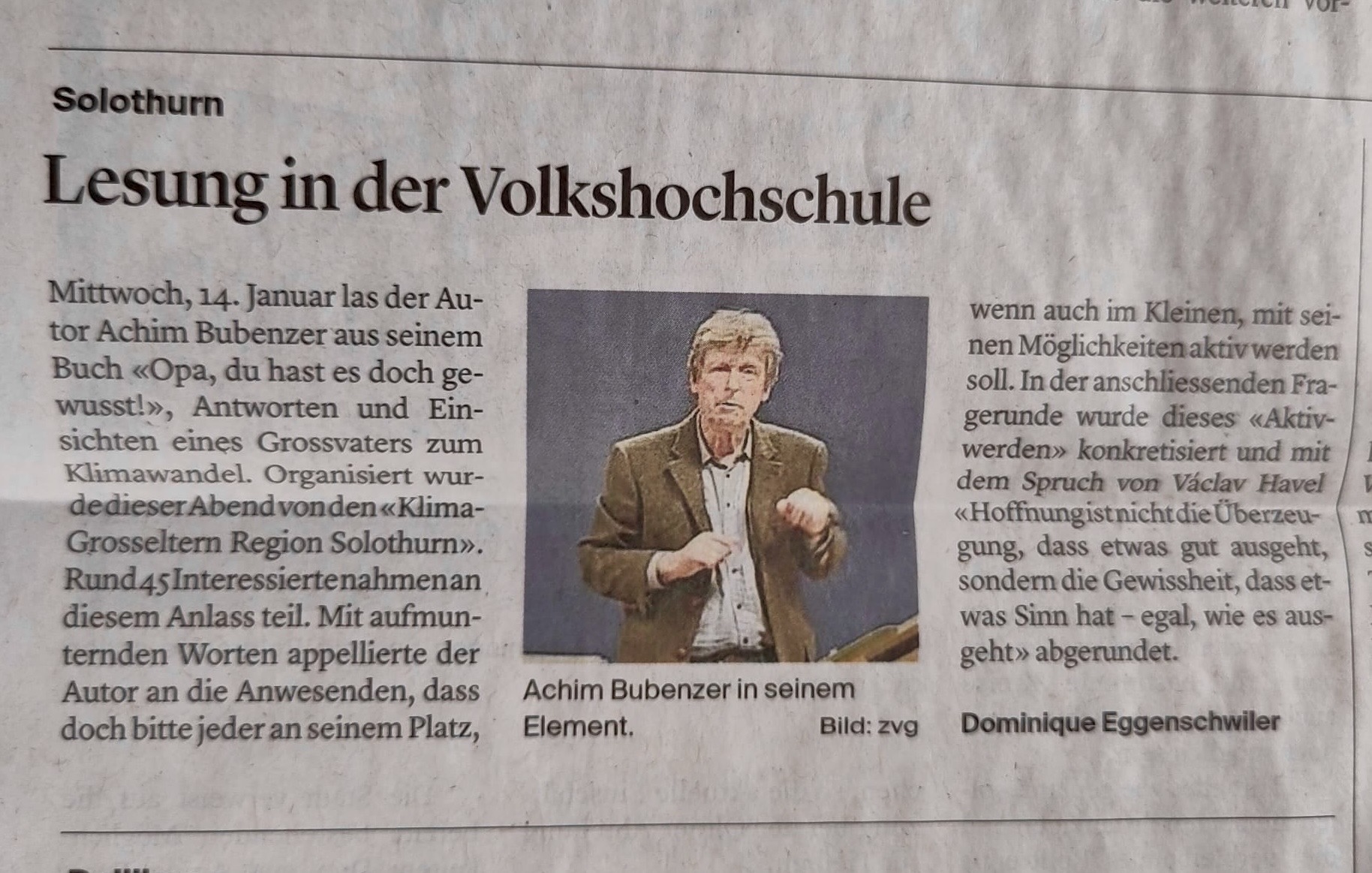 Wir danken an dieser Stelle Achim Bubenzer für seine Lesung vom 14.1.2026 in Solothurn über sein Buch "Opa, du hast es doch gewusst! Antworten und Einsichten Grossvaters zum Klimawandel. Weiter ein Dankeschön an alle Zuhörer:innen fürs Kommen. Uns von der Kerngruppe hat es gefallen!